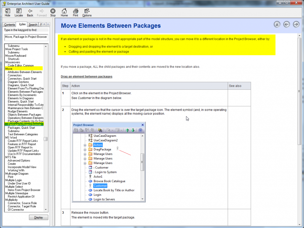In the Project Browser the drag operation changes a Package's LEVEL in the model. You drag a Package into whichever other Package you want it to be a child of, whether that Parent is deeper into the model or at a higher level. To change the sequence of peer Packages, use the green up and down arrows in the Project Browser toolbar.