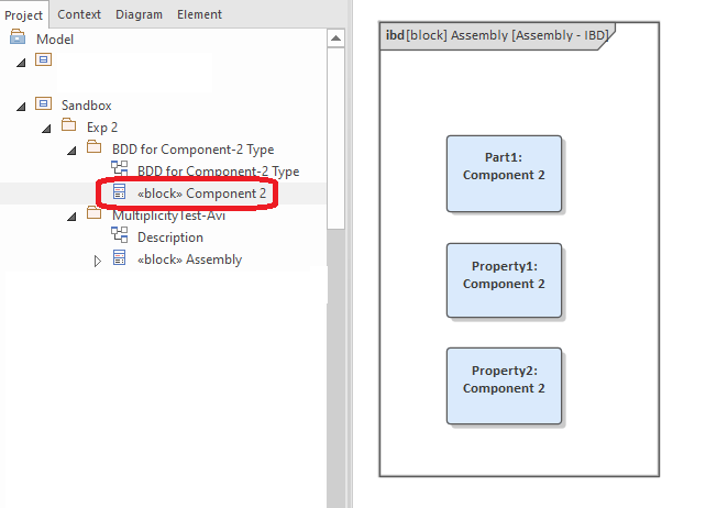 Interesting, the first time I dragged the block into the IBD, it appeared as a ‘part’ (Part1: Component 2). And then the subsequent times I dragged in the ‘Component 2’ block, the instances/usages appeared as a ‘property’.